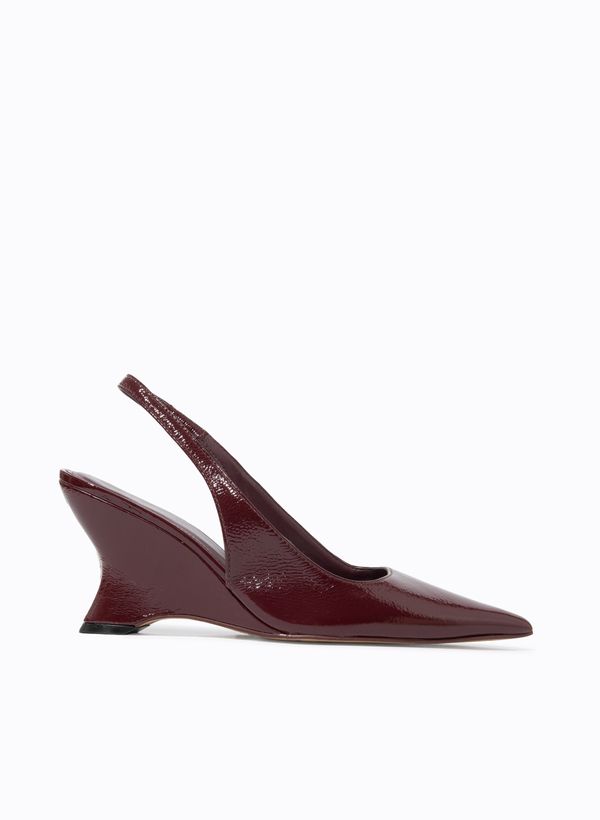 Produzido em couro, o Scarpin possui acabamento envernizado com brilho, bico fino alongado, cabedal liso com recorte clássico, laterais fechadas e decote profundo, palmilha interna com assinatura da marca, salto médio em formato bloco de 9 cm com desenho orgânico e base levemente alargada, fechamento traseiro por tira slingback com elástico e acabamento refinado na borda superior.