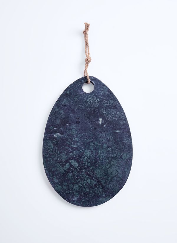 Produzida artesanalmente em mármore natural verde, a Tábua possui abertura funcional na extremidade superior, por onde passa uma alça em juta natural, facilitando o manuseio e a exposição.