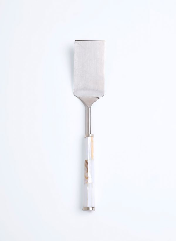 Produzida em aço inoxidável escovado com banho prateado fosco, a Espátula possui cabo geométrico inteiramente revestido em madrepérola natural, que reflete nuances furta-cor com delicadeza e brilho suave.