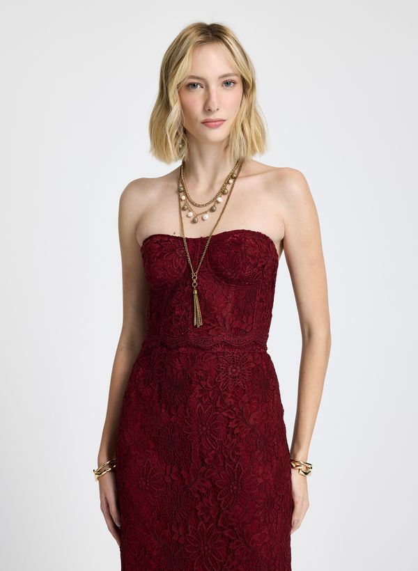 O Top é confeccionado em renda floral, possui decote tomara que caia, fechamento posterior por zíper, comprimento midi e acabamento refinado.