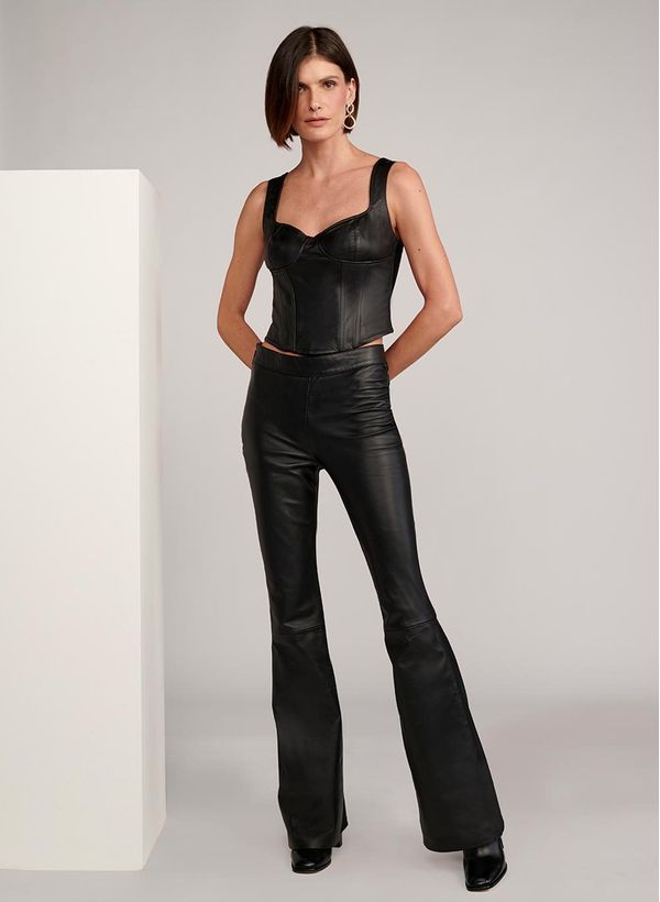 O top de couro, além de acrescentam elegância e poder na produção, são peças atemporais. Aposte no Top Pamela que possui malha posterior para mais conforto, combinando com uma calça de couro, acessórios e botas de salto, para finalizar um visual all black poderoso.