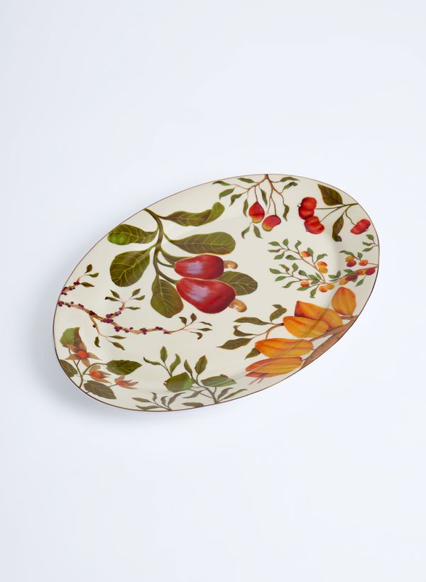 Produzida em porcelana, a Travessa Caju é uma peça sublime que possui formato oval elegante e superfície lisa, servindo de palco perfeito para seu delicado decalque que exibe frutas brasileiras em cores vibrantes, realçado pelo friso dourado que contorna a borda com refinamento e luxo discreto.
