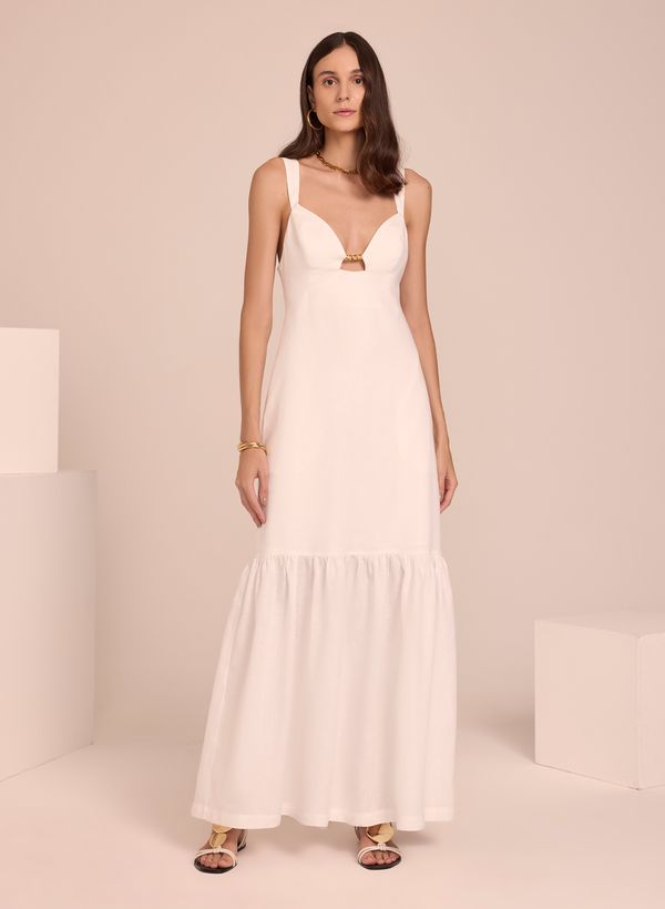 Confeccionado em linho, o Vestido possui modelagem evasê, decote profundo em V com recorte vazado central e detalhe metálico aplicado, alças largas, costas abertas com faixa superior ajustada, saia com recorte franzido próximo à barra, fechamento posterior por zíper invisível e acabamento pespontado.
