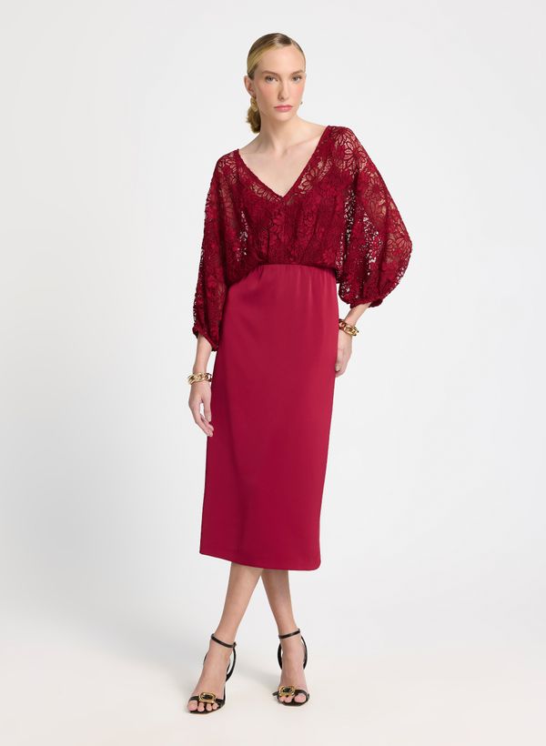 Confeccionado em tecido plano, o Vestido possui parte superior em renda floral transparente, decote V profundo frontal e posterior com alça fina horizontal, mangas longas bufantes com acabamento elástico nos punhos, cintura levemente marcada, saia de caimento reto e comprimento midi, fenda posterior discreta, fechamento posterior por zíper invisível e acabamento de barra simples.
