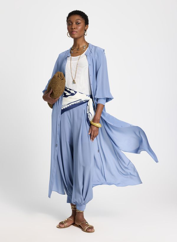 Confeccionado em seda, o Vestido possui modelagem reta, decote arredondado, pregas delicadas na gola, mangas longas com punho amplo em detalhe de lastex, cintura ajustada com cordão fino para amarração, fechamento frontal por botões forrados e comprimento midi com aberturas laterais, acabamento leve e sofisticado.