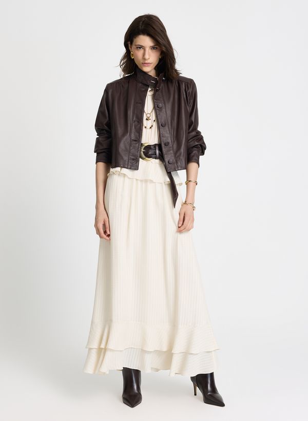 Confeccionado em tecido fluido, o Vestido possui toque macio e caimento leve, modelagem evasê, corpo levemente ajustado com cintura marcada, decote halter com amarração posterior, detalhe de babados aplicados na altura da cintura e na barra, comprimento longo, saia em camadas que proporciona movimento e fluidez, além de acabamento delicado e estrutura sem fechamento, garantindo conforto e excelente vestibilidade.