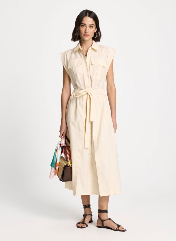 O Vestido é confeccionado em tecido plano, possui colarinho, alças largas, fechamento frontal por botões, dois bolsos frontais, saia sobreposta com cordão para amarração na cintura, comprimento longo e acabamento pespontado.