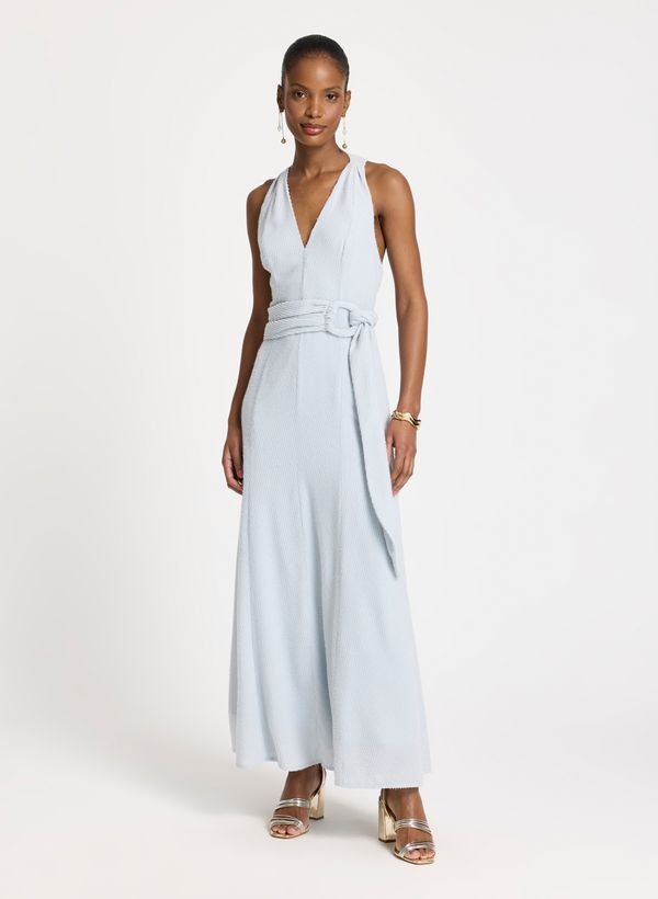 Confeccionado em tecido plano com textura sutil, o vestido possui decote V aberto, cintura marcada por um cinto largo com fivela de ajuste, modelagem reta com saia fluida de caimento amplo, comprimento longo e acabamento pespontado.
