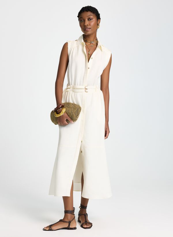 Confeccionado em linho com viscose, o Vestido possui modelagem evasê, gola clássica com colarinho estruturado, ombros com lapelas e botões metálicos decorativos, cava levemente ampliada, recorte na cintura com cinto do mesmo tecido e fivelas duplas metálicas, fechamento frontal por botões ocultos e acabamento de barra arredondada.