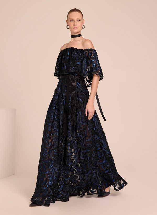 O Vestido é confeccionado em tecido sintético metalizado rendado, possui caimento acinturado, decote reto, cinto aplicado, comprimento longo e acabamento pespontado.