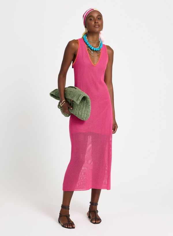 Confeccionado em tricot, o Vestido possui modelagem midi reta, decote em V profundo, cava regata, acabamento em crochê contrastante no decote e nas cavas, estrutura translúcida ao longo do comprimento e barra simples com caimento leve.