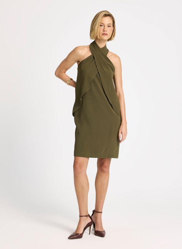 Confeccionado em tecido plano, o Vestido possui modelagem reta, comprimento curto, decote cruzado que valoriza os ombros, sobreposição frontal com recortes fluidos que criam efeito drapeado, acabamento clean na barra e fechamento posterior por zíper invisível.