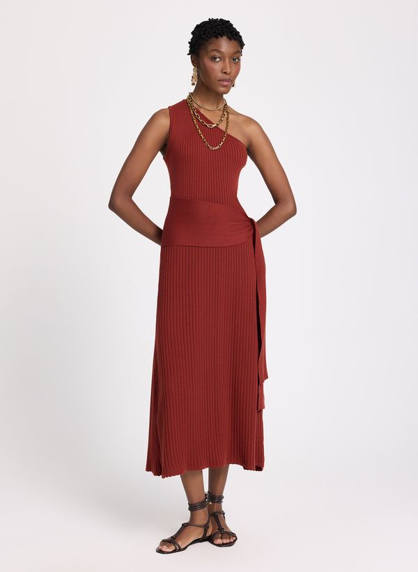 Confeccionado em tricot, o Vestido possui modelagem ajustada ao corpo, comprimento midi, decote assimétrico de um ombro só, cava sem mangas, superfície canelada em toda a extensão, detalhe de recorte lateral na altura da cintura, faixa larga aplicada com amarração lateral e acabamento em barra reta.