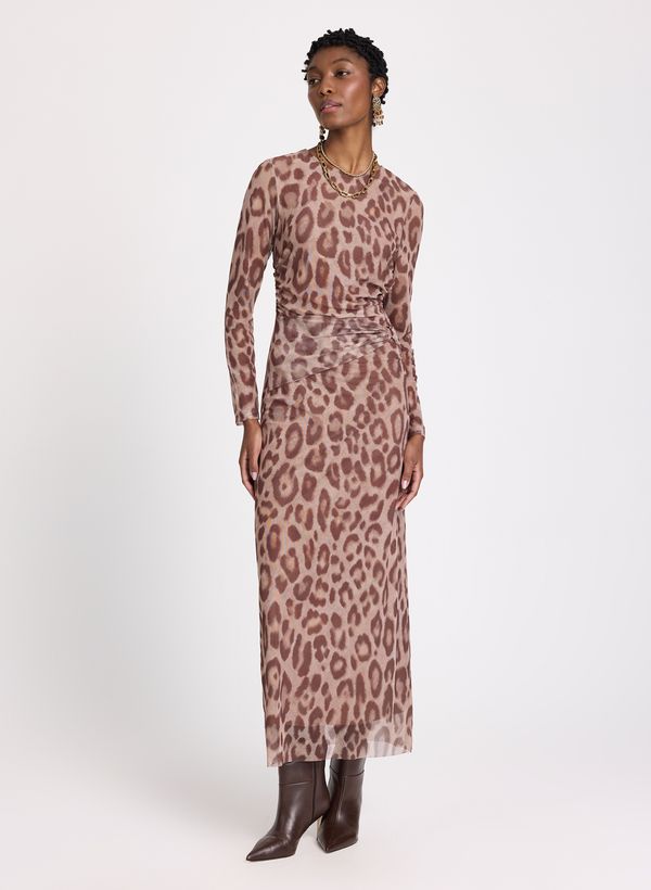 Confeccionado em tule de malha, o Vestido possui modelagem ajustada ao corpo, caimento leve, decote arredondado, mangas longas em tule com transparência, estampa animal print aplicada por toda a superfície, detalhe de franzido lateral na altura do quadril, comprimento longo, barra levemente translúcida e acabamento delicado nas extremidades.
