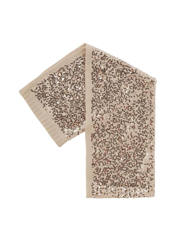 O Xale é confeccionado em tecido plano com bordado de paetês, possui formato retangular e acabamento canelado.